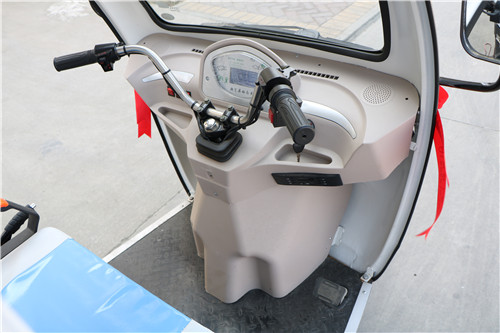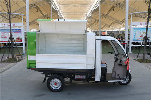 1.电动三轮中转车货厢左右及后方三开门设计快捷的开启的活动门,方便向货厢内倒垃圾,腹部设计液压升降系统,通过操作驾驶室内的控制按钮,将车厢内垃圾自动倾倒于指定位置,减轻了环卫工人劳动强度,更是节省了大量的时间,有效的提高了工作效率。